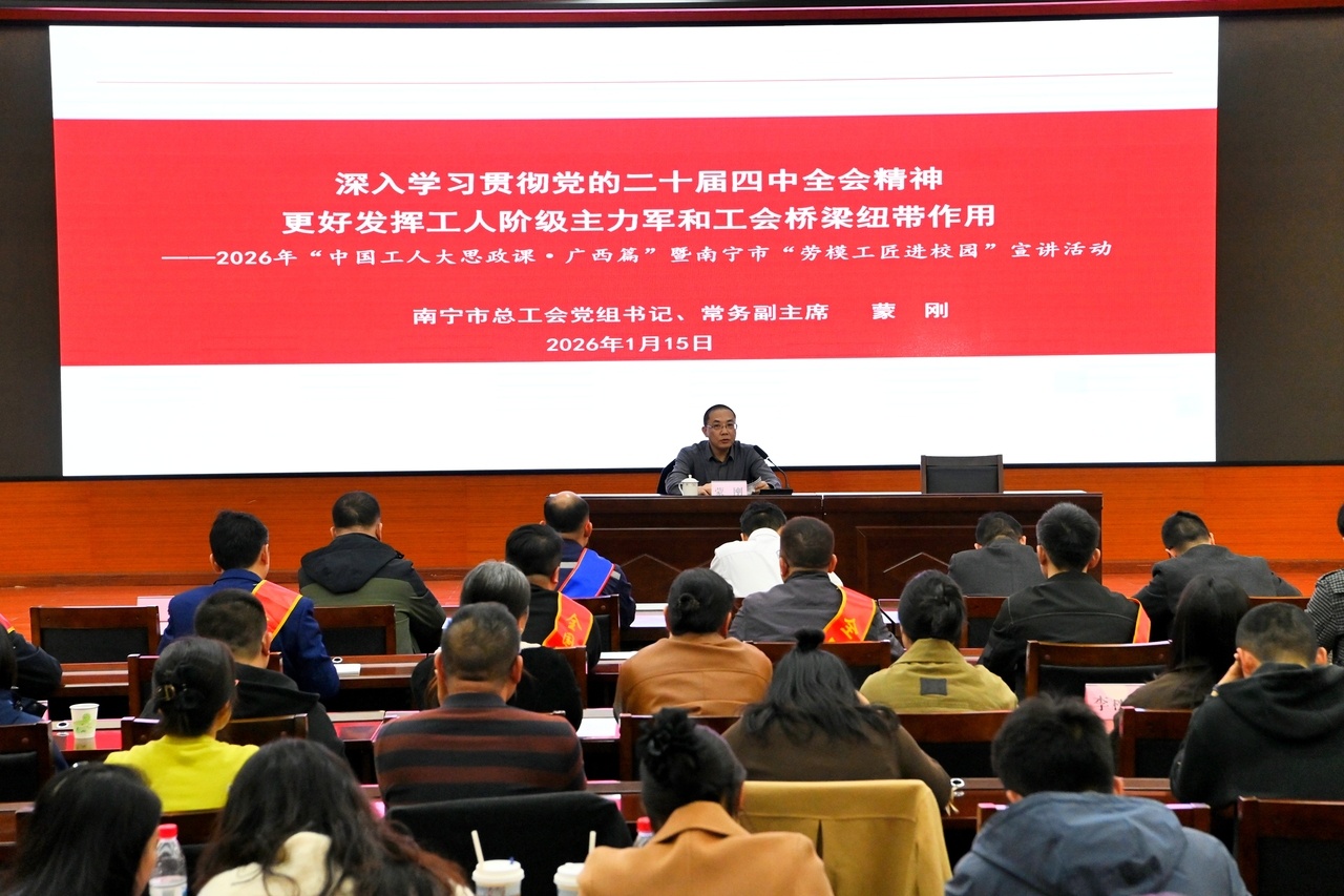1月15日,广西南宁市总工会在南宁职业技术大学举办2026年“中国工人大思政课·广西篇”暨南宁市“劳模工匠进校园”宣讲活动。南宁市总工会党组书记、常务副主席蒙刚出席开班仪式,并面向全市各级劳模工匠、职工代表及师生代表,专题宣讲党的二十届四中全会精神。